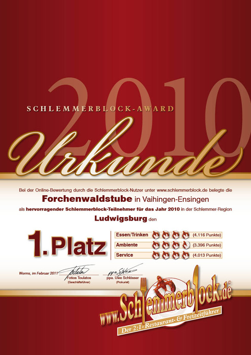 Unser Restaurant hat den Schlemmerblock-Award 2010 erhalten.